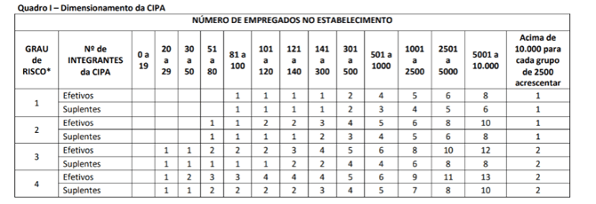 O número de membros da CIPA varia de acordo com o número de funcionários contratados no regime CLT e com o grau de risco das organizações, sejam elas: